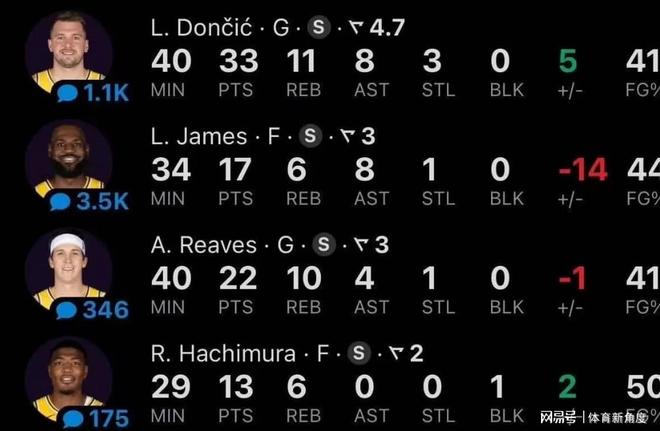 老将詹姆斯(文中“老头”指代)迎来其本赛季第二战,在进攻端,他依旧展现出凶狠的态势,积极性也肉眼可见,全场贡献了17分、6个篮板和8次助攻。不过,在防守端,他偶尔会出现懈怠的情况,脚步移动变慢,这在一定程度上影响了他在场时的正负值。但考虑到他已41岁高龄,这样的表现实在无可挑剔。