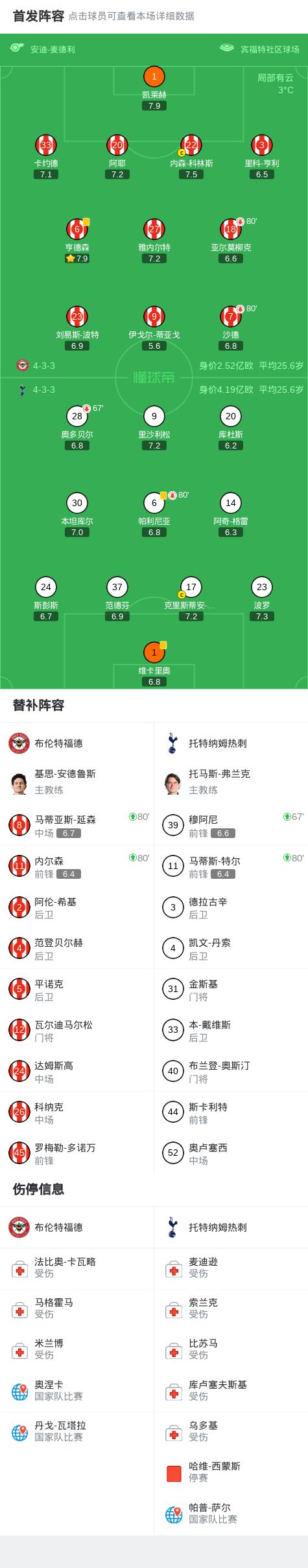 北京时间1月2日英格兰足球顶级联赛 联赛 第19轮,布伦特福德主场对阵托特纳姆热刺。上半场,沙德进球因越位在先被吹。下半场,两队依旧毫无建树,热刺全场只有3射正。全场比赛结束,热刺0-0布伦特福德。