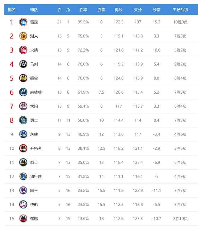 雷霆赢球后豪取13连胜,战绩21胜1负高居联盟第一,如今的雷霆堪称独孤求败。勇士输球后11胜11负,排名西部第八。