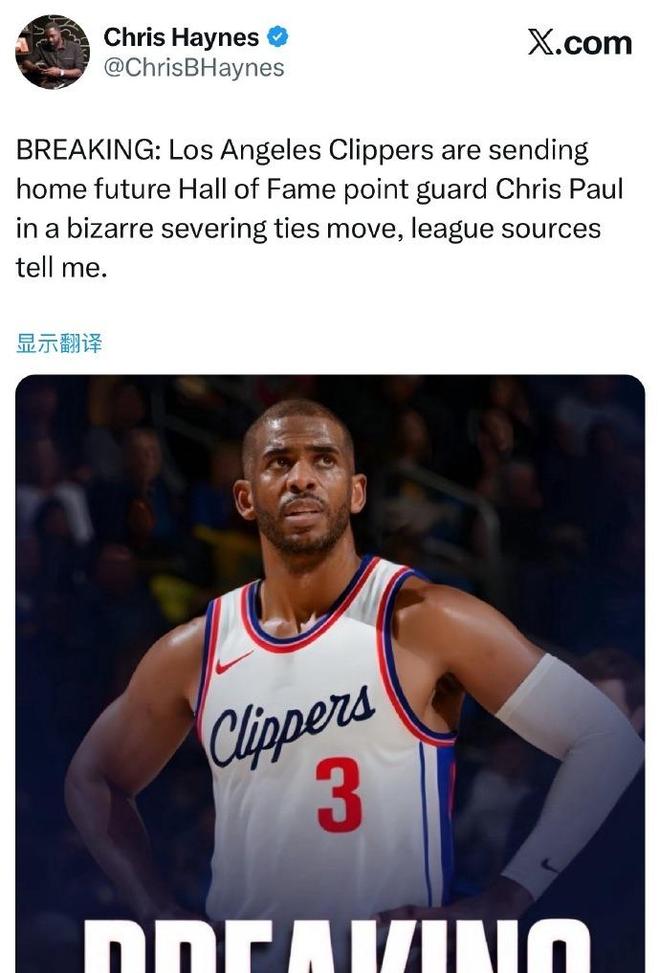 12月3日,据ESPN名记Chris Haynes在社交媒体上爆料:“快船解除了与保罗的合同!杉矶快船队正以一种诡异的解约方式,将未来名人堂控球后卫克里斯-保罗扫地出门。”